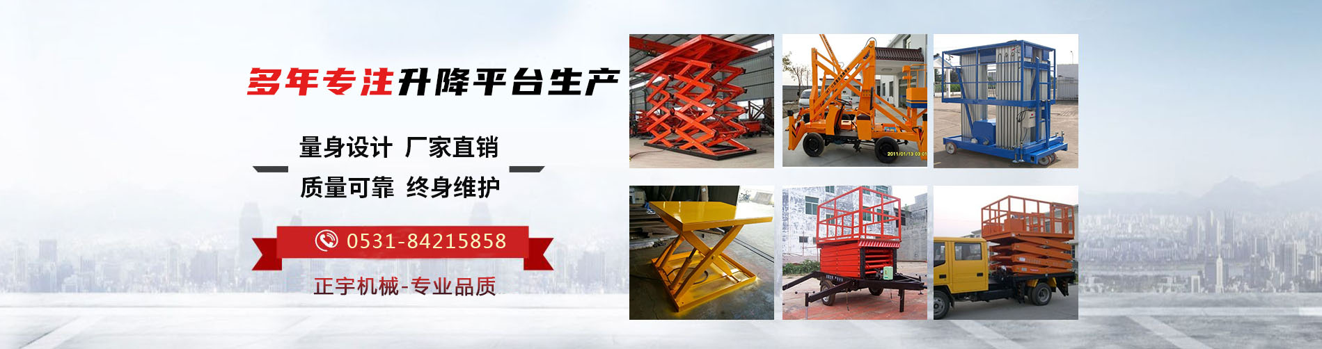 濟南正宇升降機械有限公司是一家集設(shè)計、研發(fā)、生產(chǎn)和銷售于一體的制造型企業(yè),生產(chǎn)液壓升降機械和高空作業(yè)平臺,公司處于素有泉城美稱的山東省濟南市,坐落于濟北開發(fā)區(qū)。優(yōu)越的地理位置和便利的交通給公司的發(fā)展帶來了充分的條件。正宇液壓技術(shù)力量厚,工藝流程先進合理,檢測手段齊全。目前主要產(chǎn)品有:高空作業(yè)平臺、登車橋、固定升降機、移動升降機以及鋁合金升降機等等。公司產(chǎn)品具有設(shè)計新穎、結(jié)構(gòu)合理、升降平穩(wěn)、載重安全、操作簡單、維護方便等優(yōu)點。產(chǎn)品廣泛應(yīng)用于各個行業(yè),如工礦企業(yè)、生產(chǎn)流水線、鐵路、機場、車站碼頭、貨物裝卸升舉、廠房工地、倉儲物流、高空設(shè)備安裝等場合。公司以誠信、創(chuàng)新、穩(wěn)健為宗旨,以品質(zhì)、完善服務(wù)的理念,迎接市場的挑戰(zhàn)。期待您的咨詢!